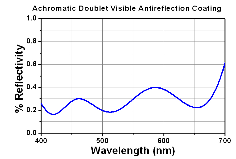 Thorlabs的胶合消色差双透镜经过计算机优化,可在可见光区域提供卓越性能。我们设计的消色差双透镜采用了氦的“d”线(587.6纳米,黄色)以及氢的“F”线(486.1纳米,蓝绿色)和“C”线(656.3纳米,红色),因为这些波长能够较好地代表可见光谱,并被用于定义材料的阿贝数V。消色差双合透镜可用于有效控制色差,且在使用激光等单色光源时,常被用于实现衍射极限光斑。